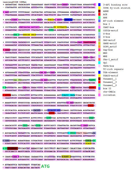 - Lescot, M.; Déhais, P.; Thijs, G.; Marchal, K.; Moreau, Y.; Van de Peer, Y. PlantCARE, a database of plant cis-acting regulatory elements and a portal to tools for in silico analysis of promoter sequences. Nucleic Acids Res. 2002, 30, 325–327. [Google Scholar] [CrossRef]