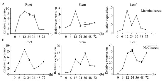 Expression patterns of the PtrDHN-3 gene in root, stem and leaf samples from P. trichocarpa sampled at 0, 6, 12, 24, 48, and 72 h. Time-course expression patterns of PtrDHN-3 in response to (A) mannitol stress. (B) NaCl stress. Expression under control conditions was assigned a value of 1, and then expression under stress treatment was normalized to this level. Error bars indicate ± SD, and each data point represents the mean of three replicate experiments.