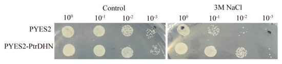 Yeast is an important tool for screening genes involved in abiotic stress resistance. For example, transference of ThvhAC1 gene from Tamarix hispida into yeast cells improved tolerance and survival of transgenic yeast under abiotic stress [34], while overexpression of TdSHN1 (Durum wheat gene) improved tolerance to Cd, Cu, and Zn stress in transgenic yeast [35]. In this study, PtrDHN-3 improved tolerance to salt stress in the transformed yeast cells (Figure 4), although there was no obvious difference under mannitol-induced drought stress (data not shown).