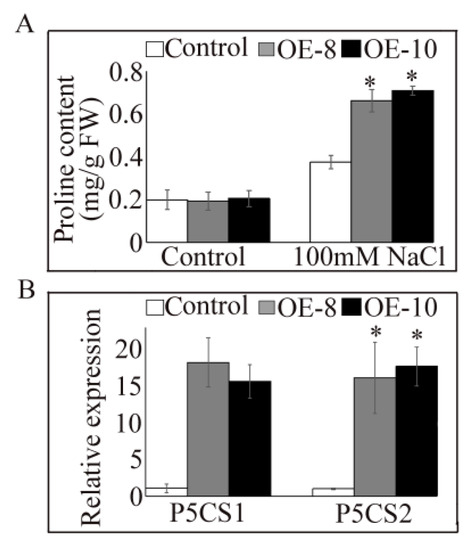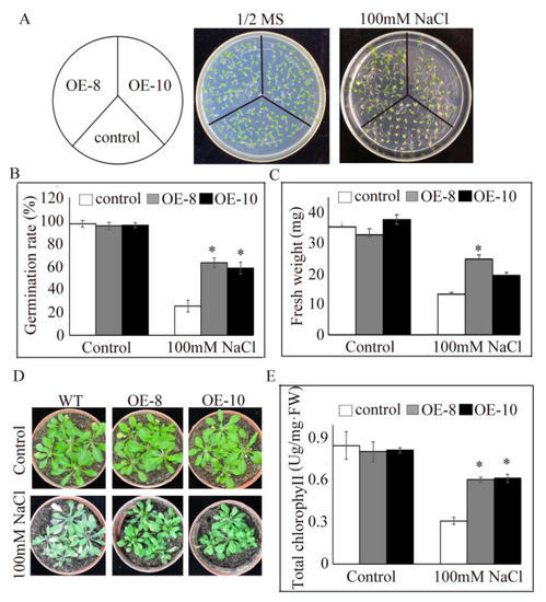 For analysis of salt stress tolerance, seeds of two transgenic Arabidopsis lines (OE-8, OE-10) and wild-type (WT) plants were sown on a 1/2 MS solid medium containing 100 mM NaCl. The germination rate was then observed after 10–14 days. Seeds of over-expressing T3 homozygous and control Arabidopsis lines were then sown on fresh 1/2 MS medium and observed for five days for germination. They were then transferred to 1/2 MS medium plates with or without (control) 100 mM NaCl and cultured at 22℃ with a photoperiod of 16 h light and a photon flux of 80–120 μmol∙m−2∙s−1. After 7-day continuous cultivation, fresh weights were then measured. Seedlings of 4-week-old T3 transgenic and WT Arabidopsis lines grown in pots were also treated with 100 mM NaCl solution for 10 days. Well-watered seedlings were used as a control. The planting method, nutrient substrate and cultivation environment were as described in Section 4.5. The phenotypes of the seedlings were then photographed with Canon EOS 7D MARKII, and contents of chlorophyll and proline in the leaves were determined. Chlorophyll contents was determined according to the description of Lightenthaler (1987) [47]. The samples were fully ground with liquid nitrogen and treated with acetone. The optical densities of supernate at wavelengths of 663 nm, 645 nm, 652 nm and 470 nm were measured. For proline assay, the ground samples were assayed by a colorimetric assay kit based on the ninhydrin reaction (Jiancheng Bio. Co., Nanjing, China) and the reaction product was quantified by its absorbance at 520 nm, calibrated with proline standards).
