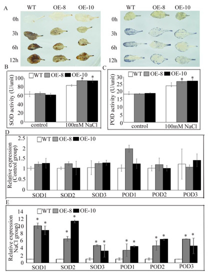 Analysis of antioxidant enzymes activity showed that SOD and POD activities were significantly higher in the transgenic compared to WT plants under salt stress (Figure 6B,C). Meanwhile, qRT-PCR analysis of SOD and POD gene expression revealed no significant differences between the OE and WT plants under non-stress conditions (Figure 6D), but a significant increase under salt stress in the transgenic plants (Figure 6E).