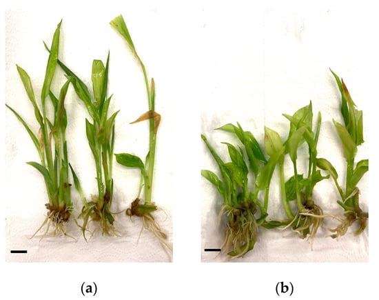 Effect of light quality on the development of C. longa after 45 days of in vitro culture. Plants irradiated with (a) white LED light and (b) RB LED light. The bar corresponds to 1 cm.