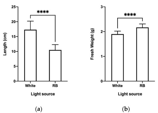 Furthermore, measurements of plant length and fresh weight at the end of TIS culture (Figure 2) revealed significant differences in both parameters: plants exposed to white light had greater height, but lower fresh weight compared to RB light-treated plants.
