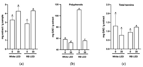 Meanwhile, plants in the RB light treatment exhibited a significant decrease in polyphenols, flavonoids, and reducing sugars after 30 days in the greenhouse.
