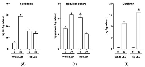 Phytochemical profiles of C. longa plants grown under different light spectra. Parameters were determined at the beginning of acclimation (0) and 30 days later (30). (a) Biomass (milligrams of extract per gram of plant matter); (b) polyphenols; (c) total tannins; (d) flavonoids; (e) reducing sugars; (f) curcumin. mg: milligrams, g: grams, GAE: gallic acid equivalents, KE: kaempferol equivalents, ND: not detected. Mean ± SD were plotted for all replicates analyzed. Tukey’s multiple comparison tests were performed at a 95% confidence level to compare the differences. Bars with different letters indicate significant differences at p < 0.05 for each parameter studied.