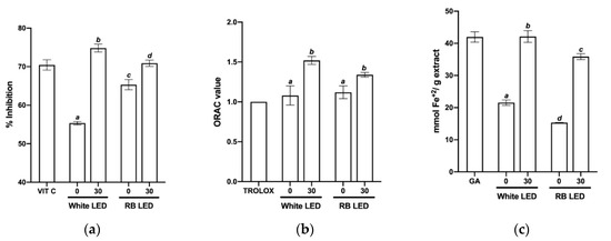 According to the ORAC assay, plants in both treatments initially showed similar radical scavenging activity, but after 30 days in the greenhouse, the activity of white light-treated plants was slightly higher (Figure 5b).