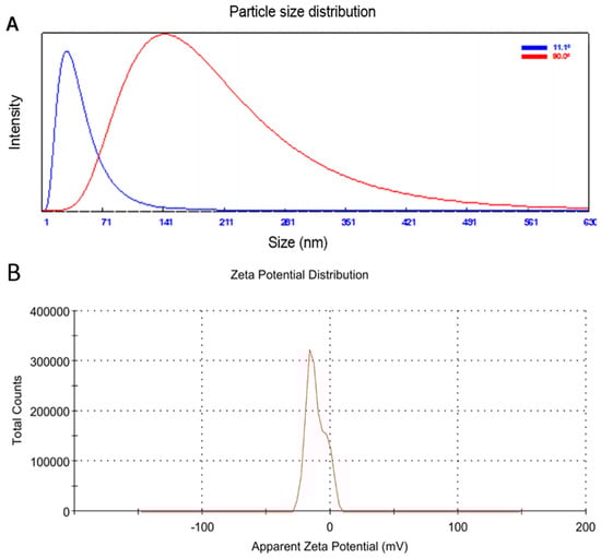A common technique is that particle size distribution in a colloidal solution can be determined with dynamic light scattering (DLS) [22]. The average particle size of the produced Ag-NPs in the aqueous medium was 32.6 nm at 11.1°, using DLS analysis in the current work (Figure 2A). The zeta potential indicated the surface charge power, which is directly related to the particle stability and toxicity [50]. As found in the literature, the zeta potential of around −30 mV characterizes particles with higher stability and lower toxicity to biological systems [51,52]. According to the results (Figure 2B), the generated Ag-NPs had good stability as evidenced by their low zeta potential of −11.1 mV [53,54]. The negative functional groups (COO-, OH-, and CO-) that were added to the surface of the produced Ag-NPs during their development from O. basilicum extract may be responsible for their net negative charge. Due to electrostatic repulsions, this negative charge promotes the stability of NPs [55].