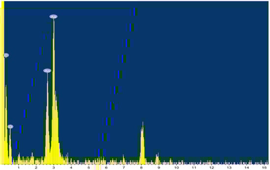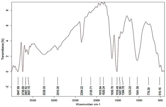 The EDX analysis approved the presence of a sharp peak at 3 KeV, related to metallic silver (Figure 3). The EDX spectrum shows the existence of silver nanoparticles as 80.69%. The presence of additional peaks (C and O2) was most likely caused by the glass that was holding the sample or could be attributed to the organic layer around the Ag-NPs [56,57]. On the other hand, the FTIR results (Figure 4) indicated a strong absorption band at 3736 cm−1, with a broad band at 3238 cm−1 usually attributed to the stretching vibrations of hydroxyl groups and primary amines [27,50]. The beak at 2915 cm−1 indicated the alkyl and CHO groups presence [58]. The strong band at 2354 cm−1, indicated C=O vibration of carboxylic groups, aldehydes, and ketones, similar to that reported in FTIR analysis of Ag-NPs prepared by different Bacillus sp. [49]. The band at 1636 cm−1 characterizes the vibration stretching for C=O carbonyl group [58], 1519 cm−1, and 1041 cm−1. Collectively, the FTIR results asserted the presence of organic capping of the prepared Ag-NPs of amide and carboxylic functional groups that accounted for Ag++ reduction, and sustained the stability of resulting NPs as previously reported [50,58].
