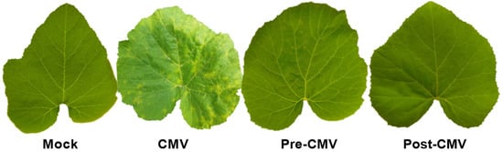 A photograph of disease symptoms on squash leaves infected with CMV 18 dpi. Mock: plants inoculated with viral inoculation buffer; CMV: plants mechanically inoculated with CMV; Pre-CMV: plants treated with Ag-NPs, 24 h before CMV inoculation; Post-CMV: plants treated with Ag-NPs, 24 h after CMV inoculation.