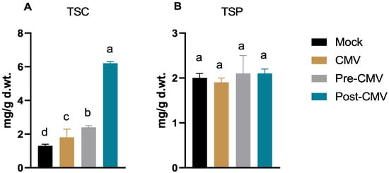 The impact of Ag-NPs foliar application upon (A) total soluble carbohydrate (TSC) and (B) total soluble protein (TSP) contents in squash plants. Mock: plants inoculated with viral inoculation buffer; CMV: plants mechanically inoculated with CMV; Pre-CMV: plants treated with Ag-NPs, 24 h before CMV inoculation; Post-CMV: plants treated with Ag-NPs, 24 h after CMV inoculation. Statistically, there is no variation between the means of the columns that share the same letter.