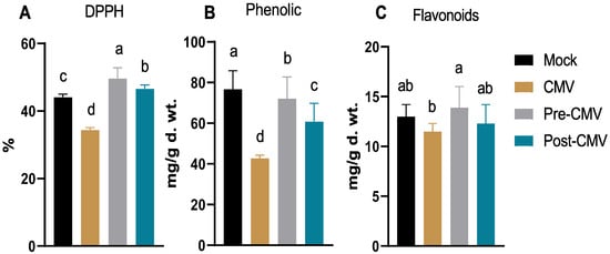 The impact of Ag-NPs foliar application on free radical scavenging activity using DPPH (A), total phenolic (B), and flavonoid contents (C) in squash plants. Mock: plants inoculated with viral inoculation buffer; CMV: plants mechanically inoculated with CMV; Pre-CMV: plants treated with Ag-NPs, 24 h before CMV inoculation; Post-CMV: plants treated with Ag-NPs, 24 h after CMV inoculation. Statistically, there is no variation between the means of the columns that share the same letter.