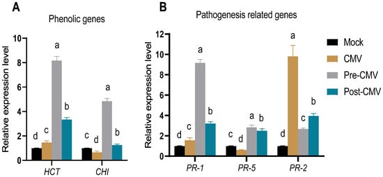 The impact of Ag-NPs foliar application on five gene expressions in squash plants. Mock: plants inoculated with viral inoculation buffer; CMV: plants mechanically inoculated with CMV; Pre-CMV: plants treated with Ag-NPs, 24 h before CMV inoculation; Post-CMV: plants treated with Ag-NPs, 24 h after CMV inoculation. Statistically, there is no variation between the means of the columns that share the same letter.