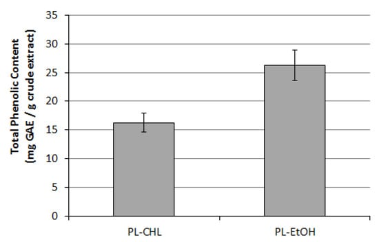 As the two organic extracts from C. colocynthis plantlets were compared, differences higher in total phenolics content than in scavenging activity were found: the ethanol extract (PL-EtOH) showed to possess 26.3 GAE with respect to 16.2 recorded for chloroform extract (PL-CHL), accordingly to the different affinity of solvents with phenolic compounds contained into plantlet tissues (Figure 2).
