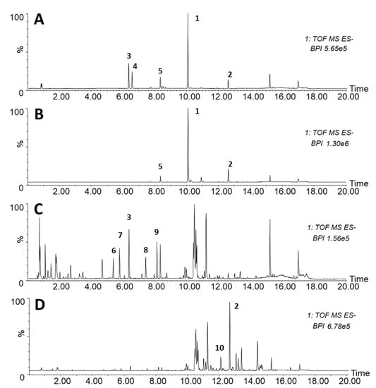 Negative LC-MS base peak chromatograms of C. colocynthis extracts. (A): ethanol-extracted seed tegument (Teg-EtOH); (B): adult leaves extracted in chloroform (Leaf-CHL); (C): ethanol-extracted plantlets from in vitro cultures (PL-EtOH); (D): chloroform-extracted plantlets from in vitro cultures (PL-CHL). Numbers indicate the following metabolites: (1) Cucurbitacin E 2-O-glucoside; (2) Cucurbitacin E; (3) Apigenin-6-C-glucoside; (4) Isoorientin 3′-O-methyl ether; (5) Cucurbitacin I 2-O-glucoside; (6) Benzyl alcohol hexosyl pentoside; (7) Luteolin-C-hexoside; (8) Methyl apigenin-C-hexoside derivative; (9) Hydroxy-methyl-methoxyflavone-C-hexoside derivative; (10) Cucurbitacin B formic acid adduct.