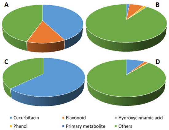 Main metabolite classes detected in C. colocynthis extracts. Cake graphs represent the percentages with respect to the total LC-MS signal of the different metabolite classes in: ethanol-extracted seed tegument (Teg-EtOH, (A), ethanol-extracted plantlets from in vitro cultures (PL-EtOH, (B); adult leaves extracted in chloroform (Leaf-CHL, (C)); chloroform-extracted plantlets from in vitro cultures (PL-CHL, (D)).