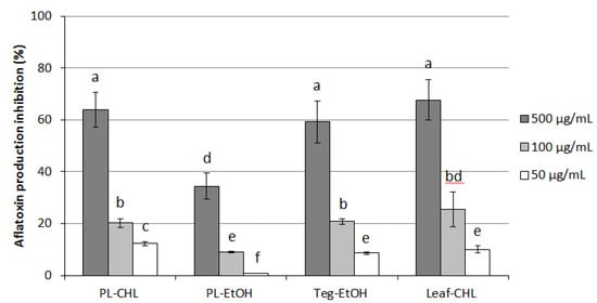 Anti-aflatoxigenic activity of chloroform (PL-CHL) and ethanol (PL-EtOH) extracts of C. colocynthis plantlets, mature leaf (Leaf-CHL), and seed coat (Teg-EtOH) at increasing concentrations. Values are means of four replicates and are expressed as inhibition percentage with respect to control ± S.D. Different superscript letters indicate statistically significant differences (p < 0.005).