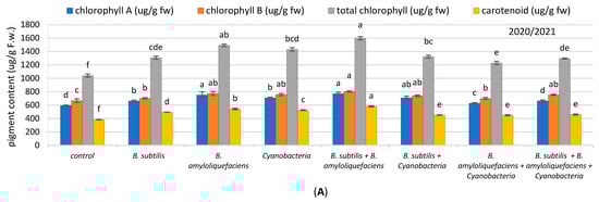 (A,B). The effect of inoculation with two PGPR strains (B. subtilis and B. amyloliquefaciens) and cyanobacteria on the pigment content (µg/g F.W.) of tomato plants in two seasons (A) (2020/2021) and (B) (2021/2022). Different letters indicate significant differences between treatments (ANOVA, LSD, p < 0.05). Error bars represent standard error of the mean.