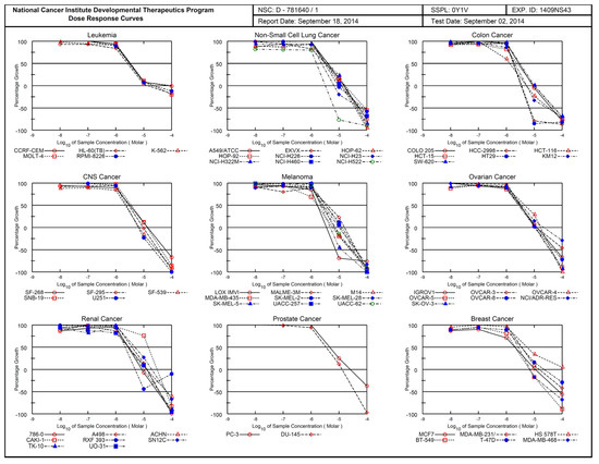 - Shoemaker, R.H. The NCI60 human tumour cell line anticancer drug screen. Nat. Rev. Cancer 2006, 6, 813–823. [Google Scholar] [CrossRef]