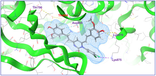 | 3 | C3 | ![]() | −4.396 | −66.538 | H-Bond (Thr790, Thr854, Lys875); Halogen Bond (Lys875); Aromatic H-Bond (Asp855) |