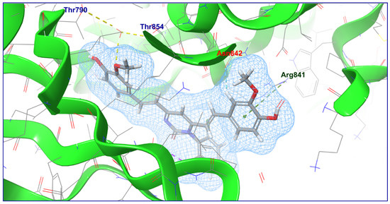 | 2 | C2 | ![]() | −5.086 | −62.292 | H-Bond (Thr790 and Thr854); π-Cationic (Arg841); Aromatic H-Bond (Asn842) |