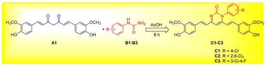 Preparation of 1-aryl-4,6-bis((E)-4-hydroxy-3-methoxystyryl)pyrimidin-2(1H)-one (C1-C3)