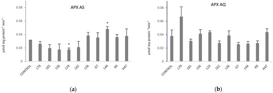 As regards to Ascorbate peroxidase activity (APX), in AS (Figure 5a) a significant decrease with L24 and a significant increase with L44 were registered. In AQ, a non-significant increase with L79 was registered.