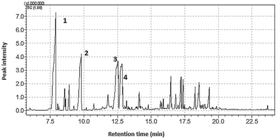 The first task was to select the solvent to be used for extraction, as the solvent has to either be more volatile than the VOCs so that it will elute before the VOCs or be less volatile so that it would elute later than the VOCs. However, the challenge with more volatile solvents is that they evaporate during the extraction; hence, they are not suited for HS sampling. Accordingly, two solvents, dodecane ((CH3–(CH2)10–CH3), boiling point = 216 °C) and heptadecane ((CH3–(CH2)15–CH3), boiling point = 302 °C), were tested for this purpose. Of the two, dodecane co-eluted with some of the volatiles, thus making heptadecane a solvent of choice given its later retention time and a higher temperature of elution. Figure 1 shows the extract of the GC-FID chromatogram obtained when 0.5 mL of the commercial pine oil was sampled with 2 µL of heptadecane for 20 min. Since the compounds could not be identified by GC–FID, the four most dominant compounds labelled 1–4 in Figure 1 were used for further optimisation.