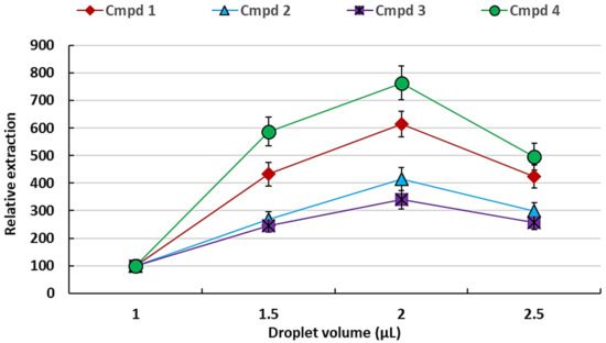 After the determination of the extracting solvent, the determination of the optimum volume of the solvent (to effectively concentrate the analytes and that would be stable when suspended from the syringe) was investigated. A series of droplet volumes ranging from 1 to 2.5 μL were tested to determine the extraction with varying solvent volume (Figure 2) using 10 min extraction time as a starting extraction time without optimisation.