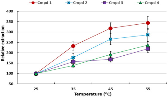 Extraction temperature plays an important role in the determination of the efficiency of the extraction, since it increases the vapour pressure of the volatile compounds, hence enriching them in the HS [15]. The temperature effect was studied from 25 to 55 °C by extracting the samples incubated at different temperatures using a water bath.