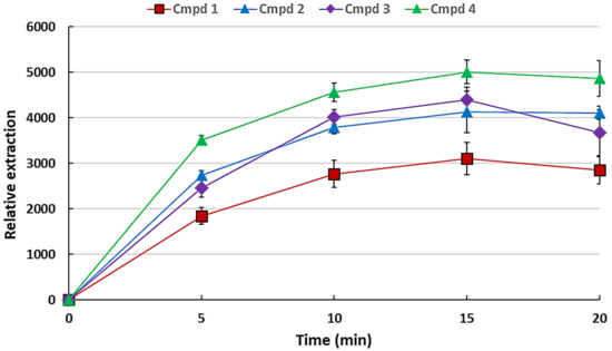 Variation of extraction time on the headspace SDME of the VOCs using 2 µL heptadecane incubated at 55 °C. The error bars indicate the standard deviation for n = 3 replicates.