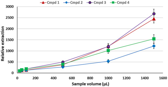 Effect of varying sample volumes (25–1500 µL) on the SDME using 2 µL of heptadecane with 15 min equilibration at 55 °C. The error bars indicate the standard deviation for n = 3 replicates.