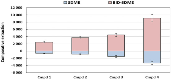 It is clearly seen in Figure 6 that the BID-SDME technique offers higher extraction efficiency than the classical SDME technique due to the increase in droplet surface area. The 2:1 drop to bubble ratio was further used for BID-SDME combined with the optimised parameters for application in real plant samples.