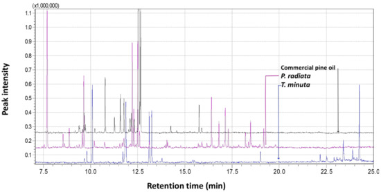 Consequently, a lower plant sample amount of 0.5 g was used for further experiments. The crushed leaves were thus incubated at 55 °C in a GC-vial in a water bath and sampled using the optimised parameters. Figure 7 shows representative chromatograms of the GC-MS analysis of T. minuta and P. radiata in comparison to the commercial pine oil that was used for method development and optimisation.