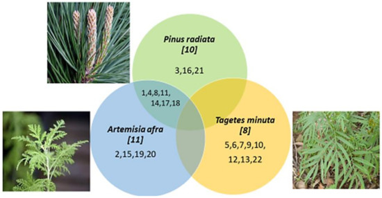 For a comparative analysis, the annotated VOCs (all terpenes or terpenoids) from the three different plants were compared by means of a Venn diagram (Figure 8), indicating the distribution of the VOCs between the shared vs. exclusive sections of the diagram. Structures of the VOCs are grouped in Supplementary Table S1.