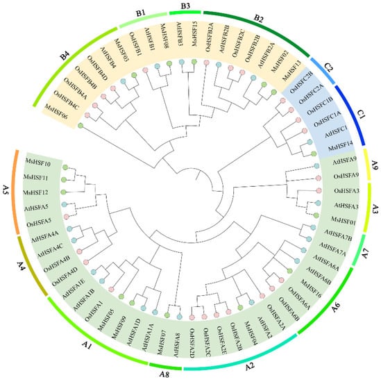 Only 16 HSF genes have been found in M. sativa, which is less than other plant species and may reflect the lack of expansion of the MsHSF family. MsHSF genes might be further grouped into three categories using homology matching and multispecies matching: A, B, and C. They are clustered in the same way as the members of the A. thaliana HSF gene family, with group A having the most genes and group C having the fewest []. Three subgroups, A4, A7, and A9, are missing from M. sativa, demonstrating that despite HSF family proteins sharing a common ancestor, they have evolved separately in different species. The majority of the alfalfa HSF proteins grouped with the A. thaliana HSF proteins but not with the O. sativa HSF proteins, suggesting that MsHSF and AtHSF have a tight evolutionary relationship. The HSF proteins of dicotyledons and monocotyledons have evolved in quite different ways.
