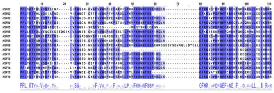 HSF protein sequences from the A. thaliana TAIR database (https://www.arabidopsis.org/) (accessed on 7 June 2022) were used as a reference sequence, and members of the putative MsHSF gene were sought using M. sativa genomic data from the National Genomics Data Center (https://ngdc.cncb.ac.cn/) (accessed on 7 June 2022) and a BLASTP search. We then used the native HMMER 3.0 software (Robert, D.F.; Ashburn, VA, USA) [], using Hidden Markov (HMM) mapping of the HSF protein (PF0047), downloaded from the pfam database (http://pfam.xfam.org) (accessed on 9 July 2022). The potential gene members of M. sativa HSF identified were pooled using these two search techniques. WebCD-search (https://www.ncbi.nlm.nih.gov/cdd) and SMART (http://smart.embl.de/) were used to identify conserved HSF structural domains in all potential MsHSF genes (accessed on 9 July 2022). We finally identified 16 MsHSF genes and renamed them according to their position on the M. sativa chromosome.