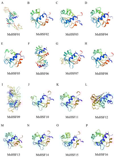 Three-dimensional model of the protein of MsHSF family members, with the starting position of the α1 DBD structural domain indicated by 1. (A–P) in the figure represent the 16 proteins of the M. sativa HSF family, respectively.
