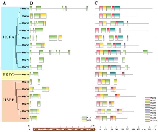 HSF proteins were split into three categories, HSF A, HSF B, and HSF C, based on the phylogenetic analyses mentioned above (Figure 4A). Our analysis of the MsHSF gene structure revealed that HSF genes from the same group typically have a similar number of introns in their structures. There is just one intron and two exons shared by all HSFB and HSFC genes in M. sativa (Figure 4B). Except for MsHSF12, which had eight introns, the M. sativa HSF A genes ranged in intron count from one to four. Three genes included two introns; three genes (MsHSF01, MsHSF07) contained four introns; two genes (MsHSF10, MsHSF11) contained one intron. MsHSF09 and MsHSF016 contain four introns.