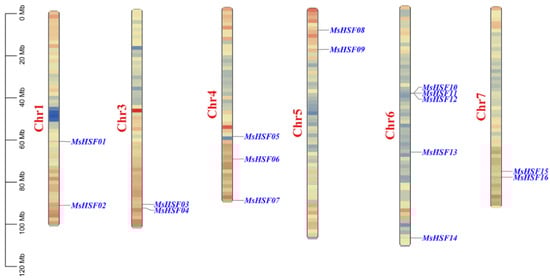 M. sativa HSF genes were unevenly distributed on the six chromosomes (Figure 5). This included chromosomes 1, 3, 4, 5, 6, and 7, with the largest number of genes found on chromosome 6 with 5 genes, followed by 3 genes found on chromosome 4. All the remaining chromosomes contained only 2 MsHSF genes each.