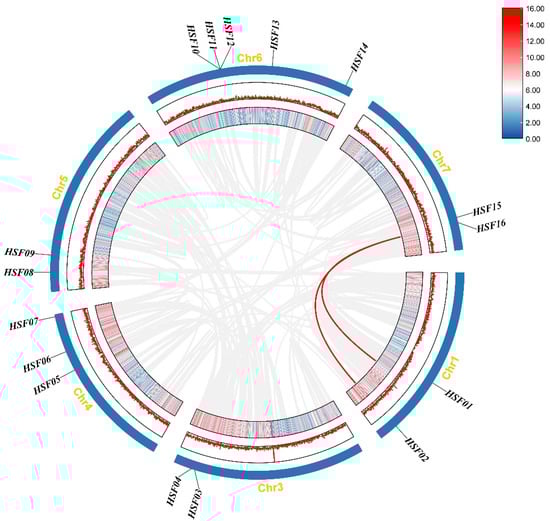 Chromosome distribution and interchromosomal relationships of MsHSF genes. Gray lines indicate synthetic blocks within the M. sativa genome, and red lines indicate duplicated MsHSF gene pairs.