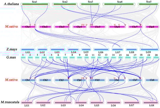 Synthetic analysis of the M. sativa genome with the genomes of one monocotyledon and three dicotyledon plants. Gray lines represent alignment blocks between paired genomes, and blue lines indicate synthetic HSF gene pairs.