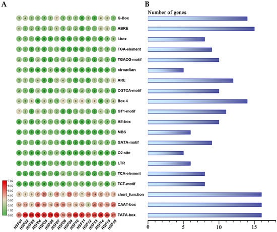A schematic representation of the cis-acting elements identified in the 2000 bp promoter region upstream of the MsHSF gene. The different colors represent the number of cis-acting elements contained (A). The number of MsHSF genes corresponding to the cis-acting element (B).