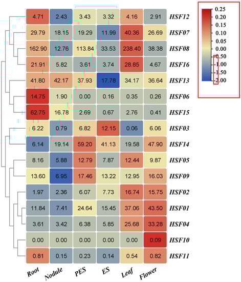 A heat map representation of MsHSF expression between different tissues. The values in the rectangle represent the magnitude of the gene expression.