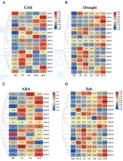 Expression of 16 MsHSF genes in cold (A), drought (B), ABA (C), and salt (D) treatments. The values in the rectangle represent the magnitude of the gene expression.