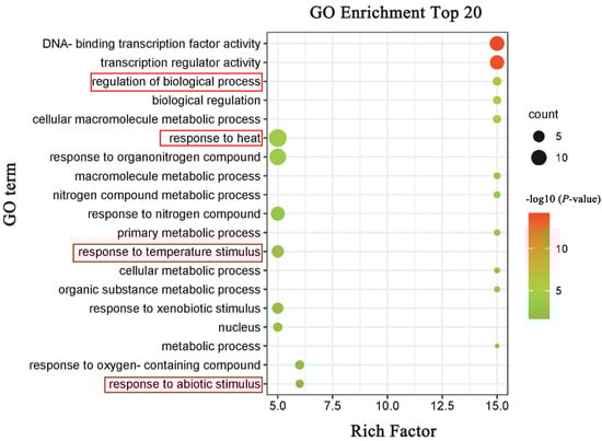 GO enrichment analysis of the MsHSF proteins relative to the GO database. The horizontal axis indicates the enrichment factor, and the size of the circle indicates the number of genes annotated with a given GO term.