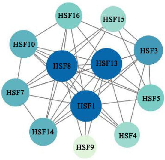 HSF protein sequences were uploaded to the STRING database (https://string-db.org/) (accessed on 19 August 2022) for node comparison, and relationships between important proteins were predicted based on A. thaliana protein interactions. Finally, Cytoscape (Shannon, P.; California, USA) [] was used to visualize the generated networks.