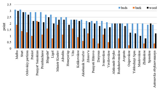 Significant damage to the wood was noted in ‘Melba’, ‘Blagodat’, Orlovsky Partizan’ and ‘Start’ (2.5–3.0 points).