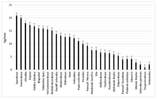 On average, during the study period, triploids ‘Blagodat’, ‘Patriot’, scab-immune cultivars ‘Afrodita’, ‘Venyaminovskoye’, ‘Ivanovskoye’, Solnyshko,‘Start’, scab-immune triploids ‘Rozhdestvenskoye’, ‘Zhilinskoye’, ‘Candil Orlovsky’, ‘Start’, ‘Maslovskoye’,’ Spasskoye’ and ‘Yablochny Spas’ significantly surpassed the productivity of the rest of the studied cultivars, the yield of which was at the level of ‘Antonovka’ (