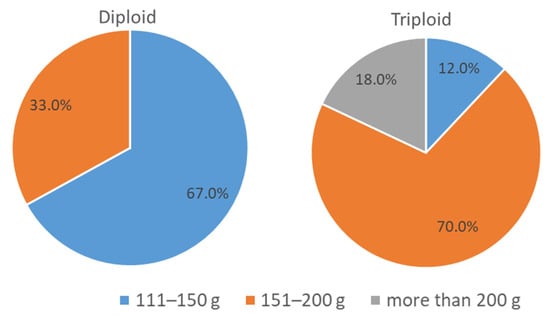 In the triploid group, cultivars with large fruits, with an average weight of 151–210 g and above average weight, prevail; in the diploid group, most cultivars have an average fruit weight of 140–150 g (
