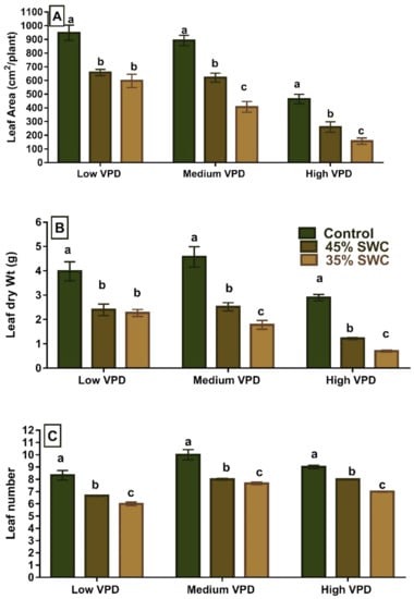 Figure 1. Average (A) Leaf area (cm2/plant) and (B) Leaf dry wt. (g/plant) and (C) Leaf number of maize under low, medium and high vapor pressure deficit (VPD) conditions to three different soil water levels (Well-Watered, 45% Soil water content (SWC), and 35% SWC). The bars (±average) represented by the same alphabet were not significant at p < 0.05 based on Tukey’s Kramer method at that particular VPD level.